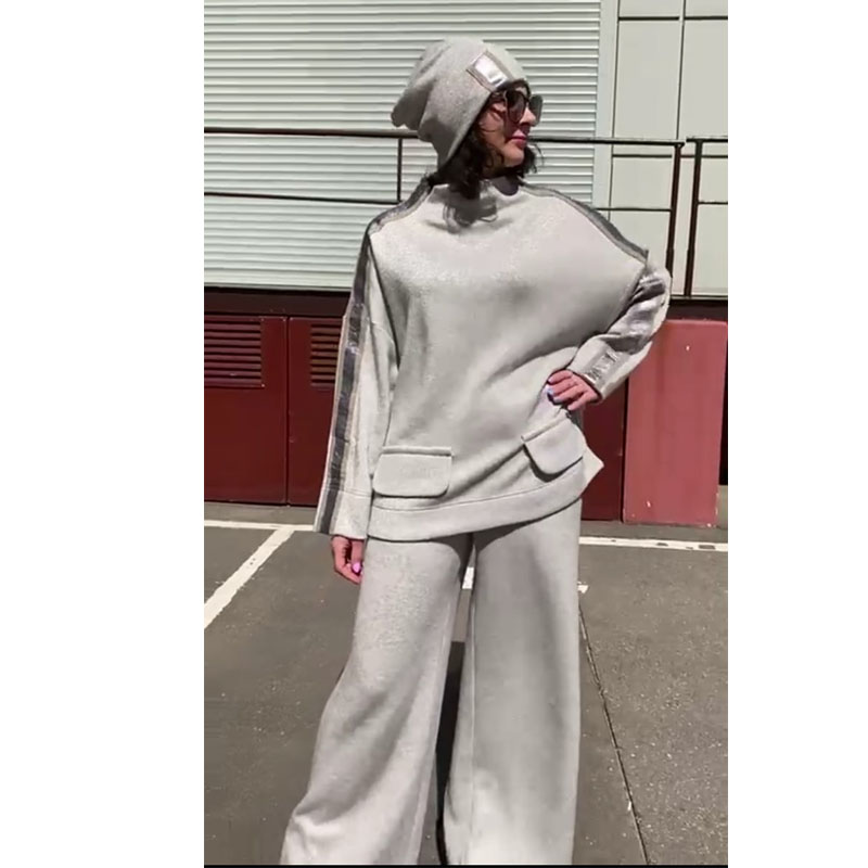 Брюки свободного кроя из трикотажа с легким блеском: пояс на резинке, кулиска по поясу, врезные карманы в боковых швах.