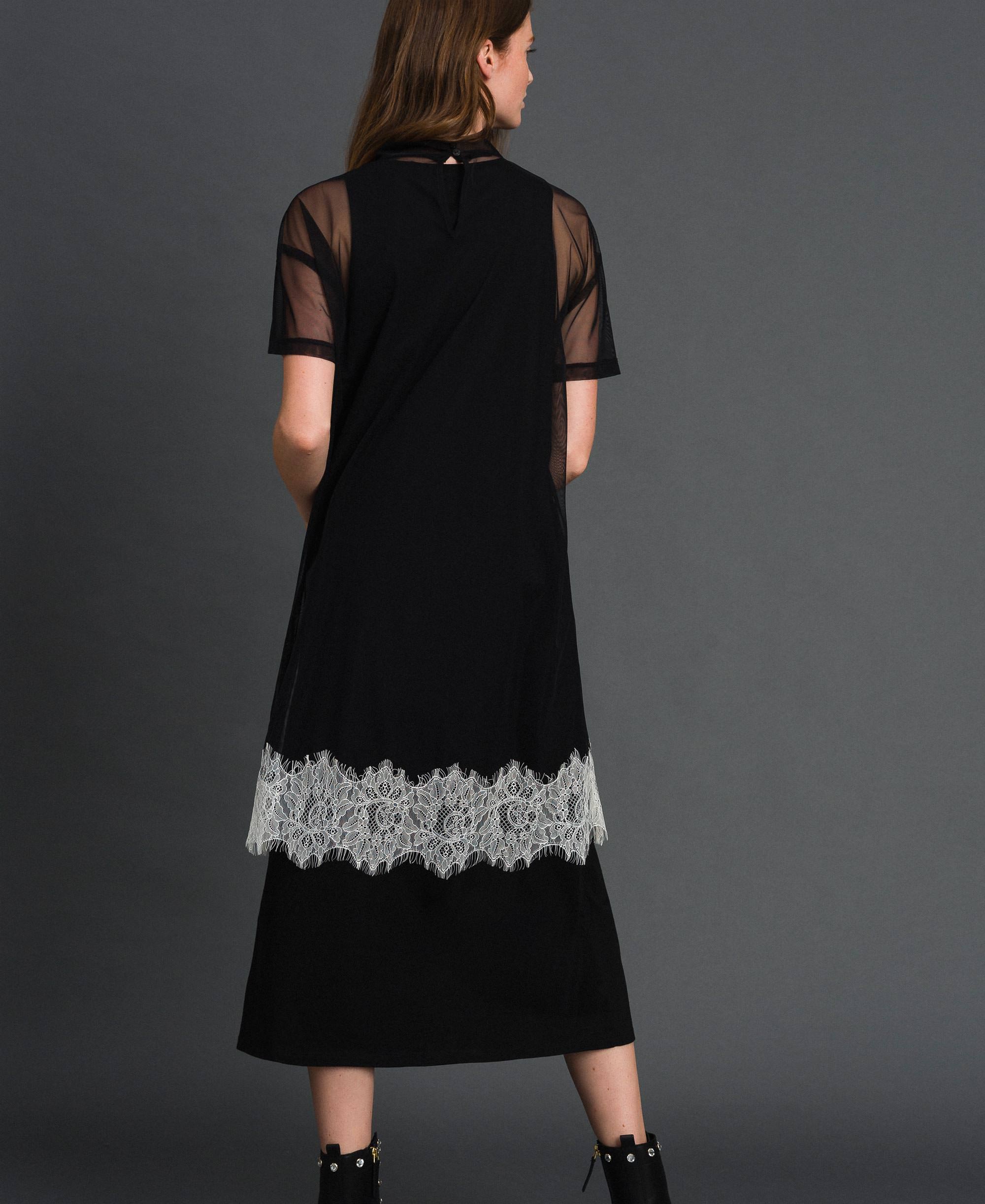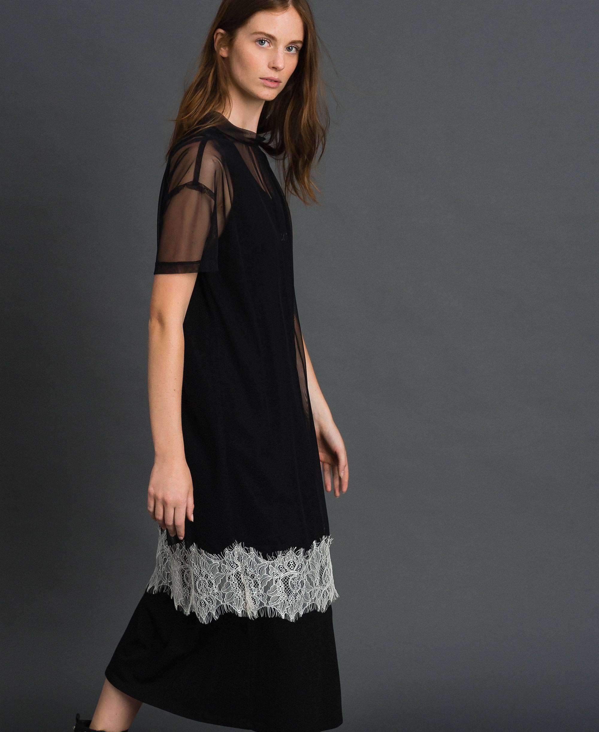 Платье миди из джерси, дополненного фатином, короткие рукава, контрастная кружевная лента, логотип.