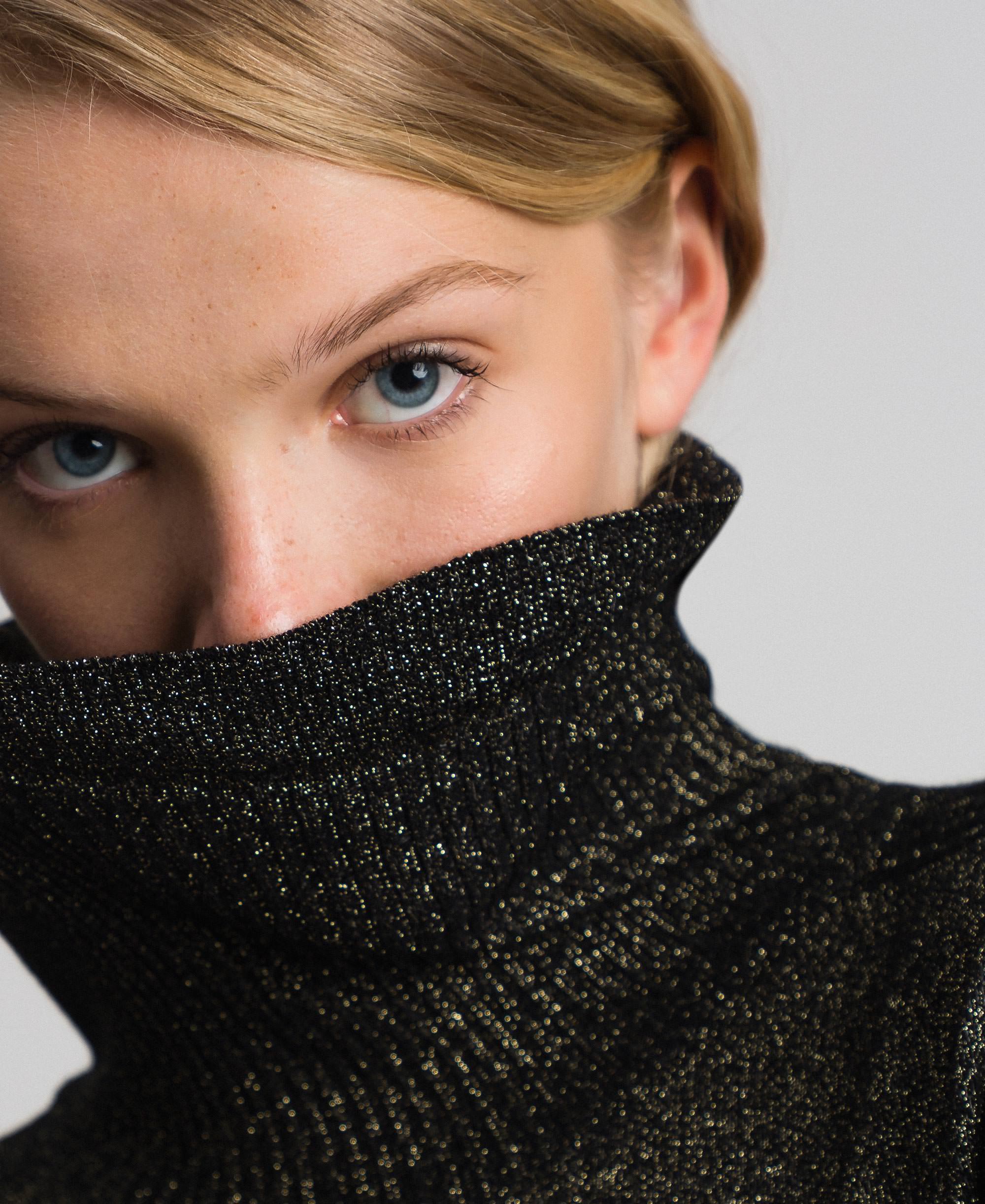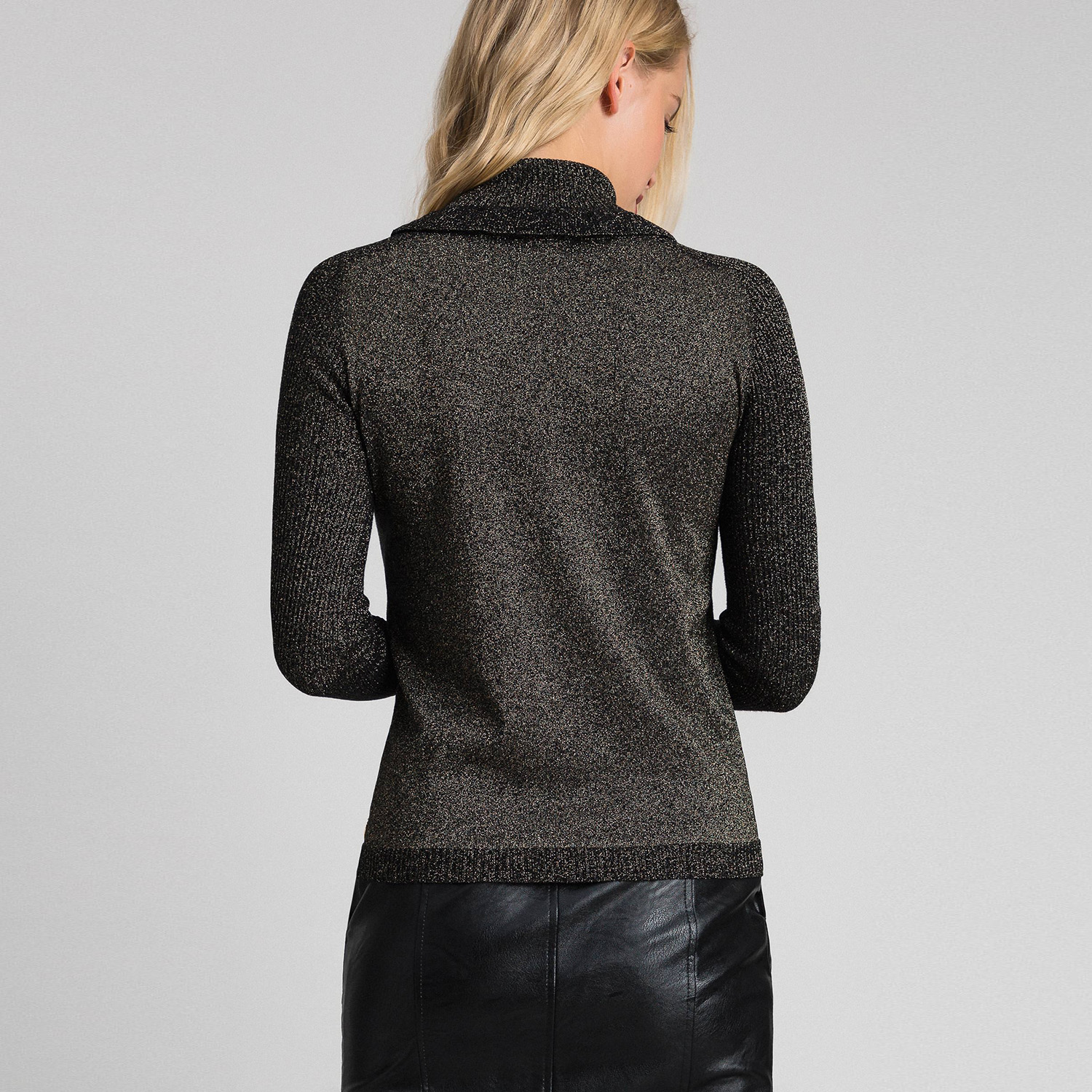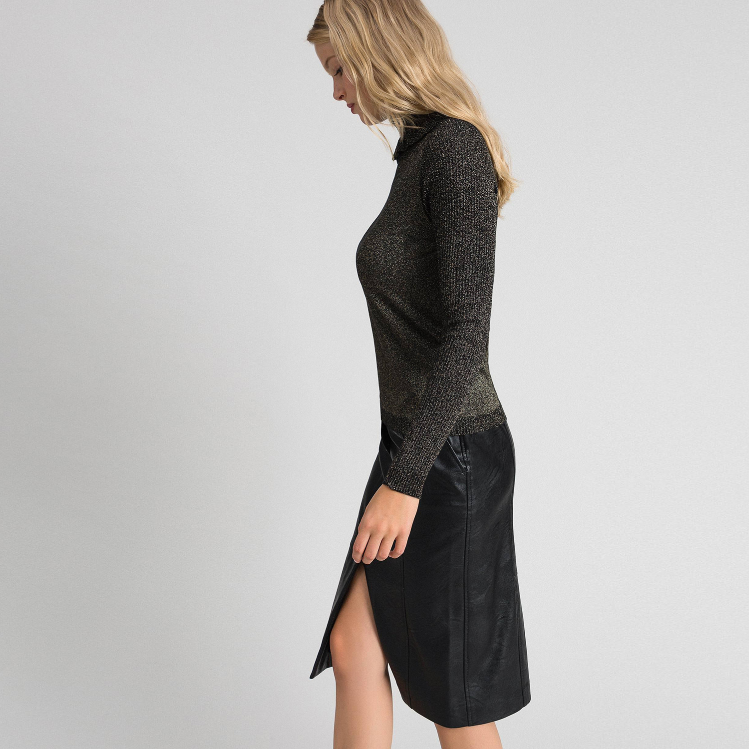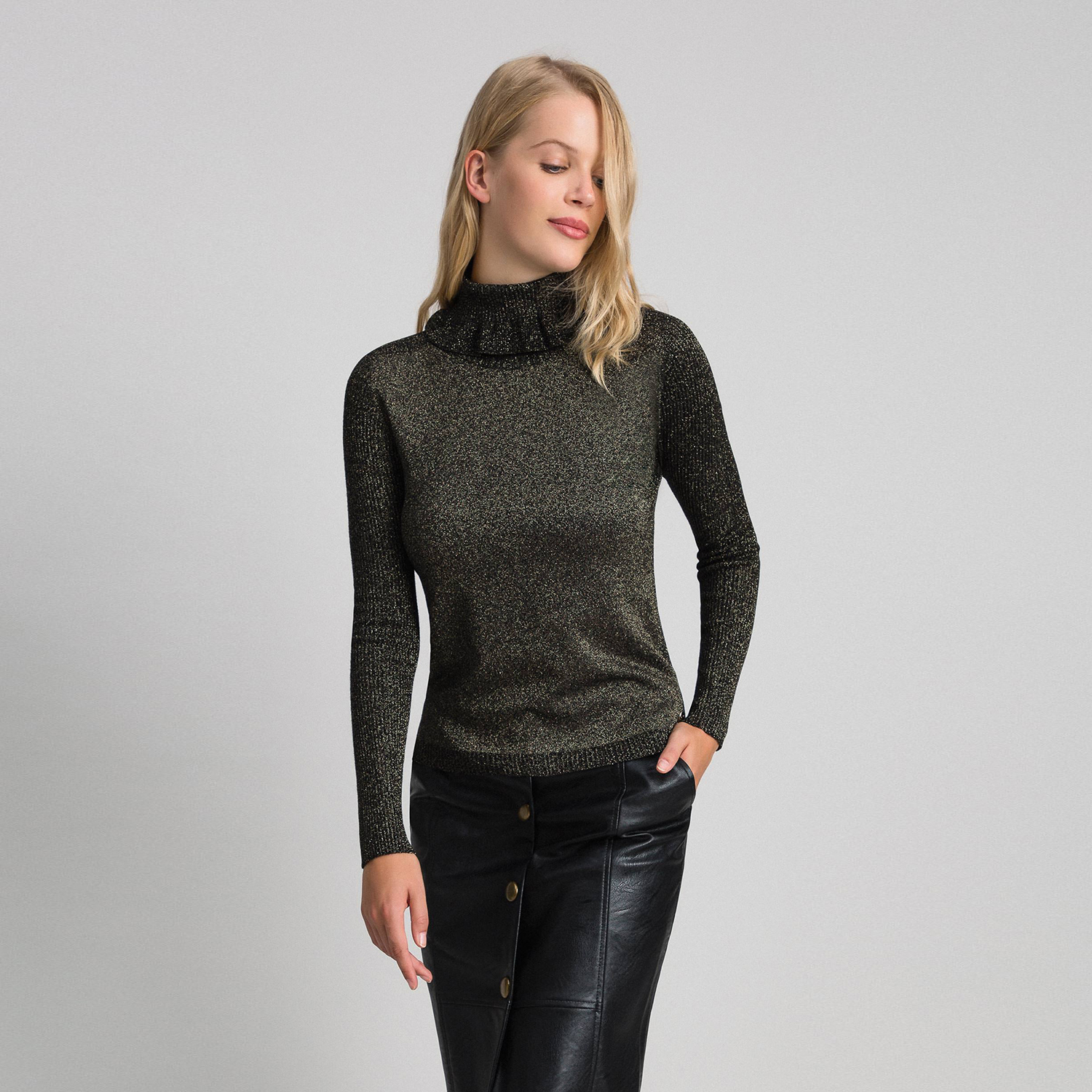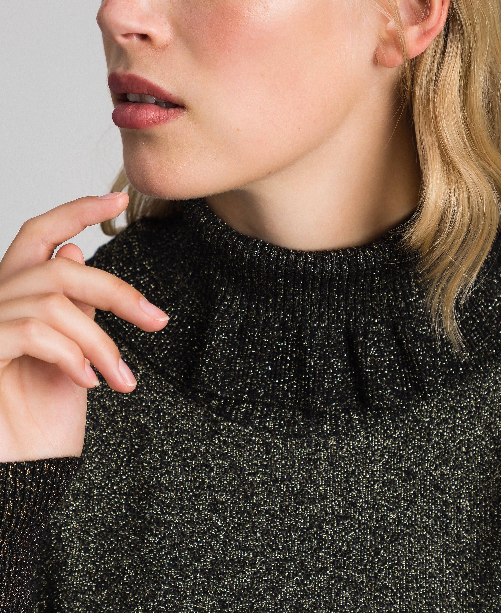 Джемпер с высоким воротником и длинными рукавами из вискозы и люрекса в рубчик. Изделие, дополняющее ваш образ. Удобный джемпер из вискозы и люрекса в рубчик, высоким воротником и длинными рукавами.