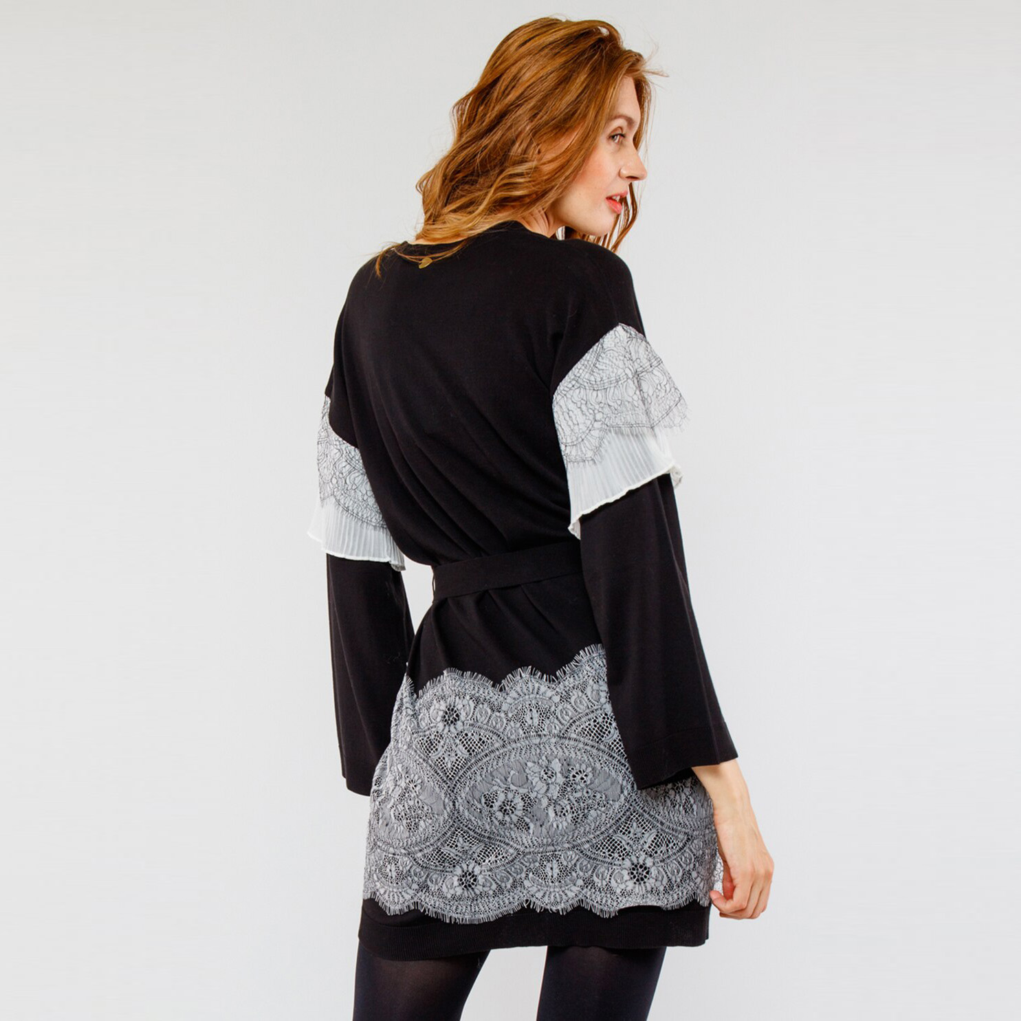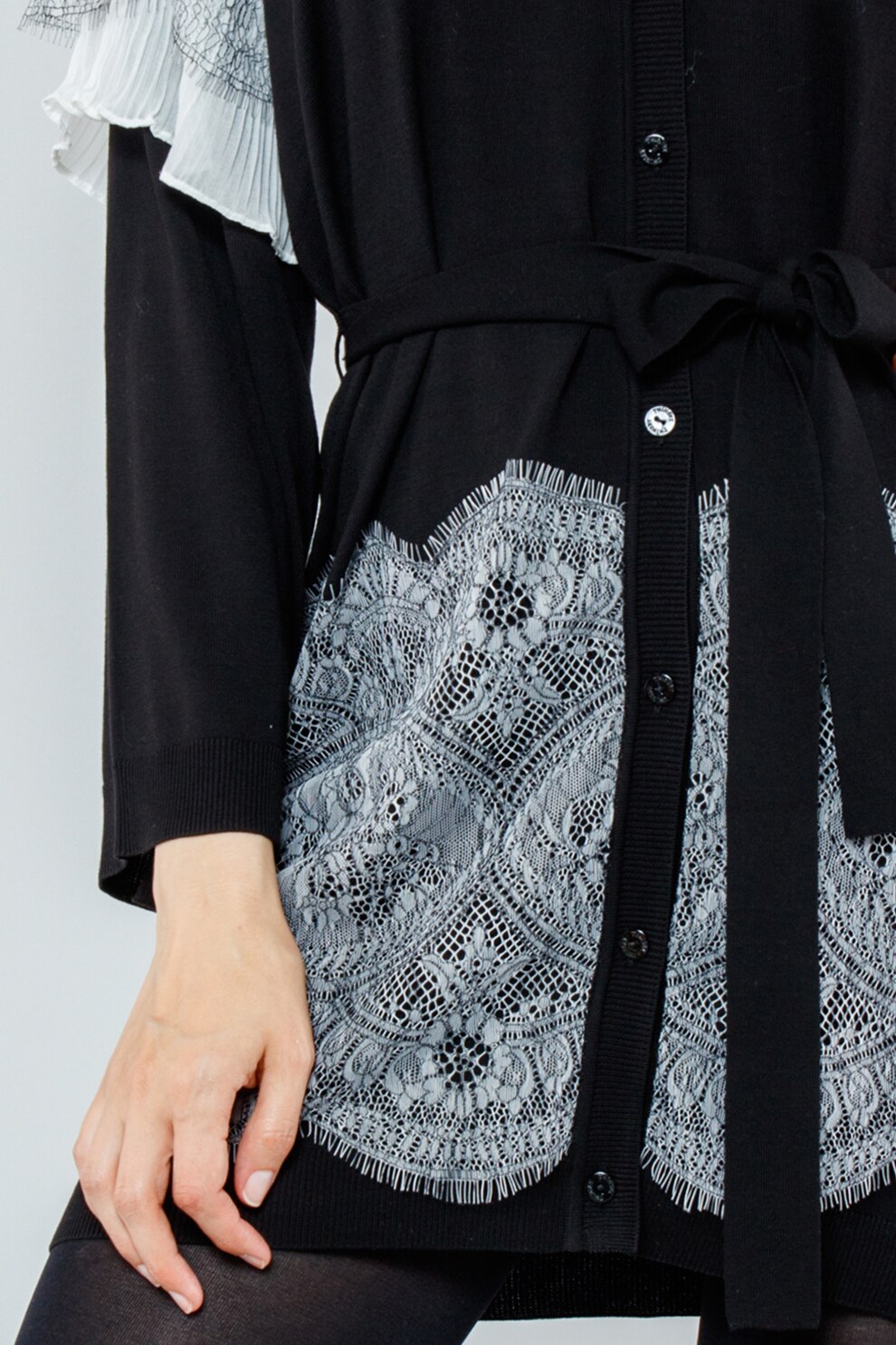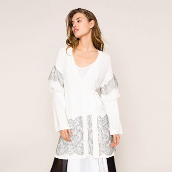 Завершите свой образ романтическим и шикарным оттенком макси-кардигана из хлопковой смеси с двухцветными кружевными деталями на рукавах в сочетании с плиссированной тканью, V-образным вырезом, застежкой на пуговицах и поясом на талии, низом, отделанным зубчатым кружевом.